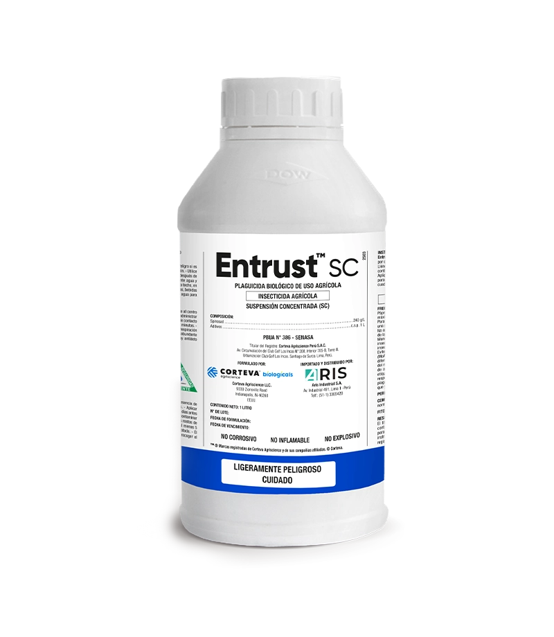 Entrust SC es un insecticida orgánico formulado a base de Spinosad, molécula derivada de la fermentación producida por el actinomiceto Saccharopolispora spinosa. Actúa tanto por ingestión y por contacto, afectando principalmente diversos estadios larvales e insectos picadores-chupadores en un amplio rango de cultivos.